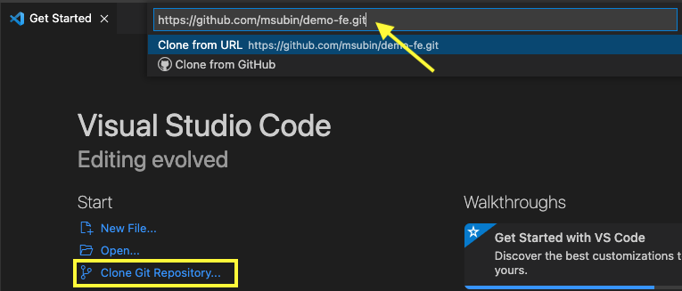- Git repository 주소를 복사하여 VSC 비주얼 스튜디오 코드에서 git clone 한다.