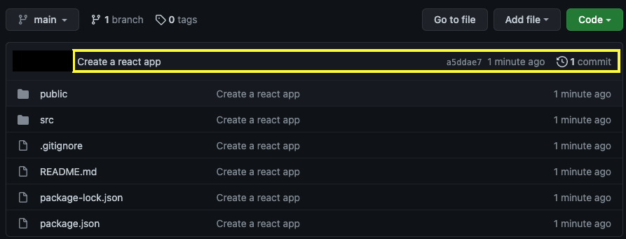 - Github 상에서 해당 repo를 새로고침하면 아래와 같이 'Create a react app' 커밋 메시지와 함께 업데이트 된 것을 확인할 수 있다.