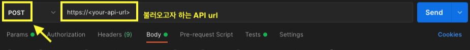 1. 데이터를 요청할 url을 설정하고, method는 POST로 설정