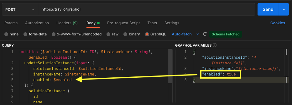 mutation($solutionInstanceId: ID!, $instanceName: String!, $enabled: Boolean!) {