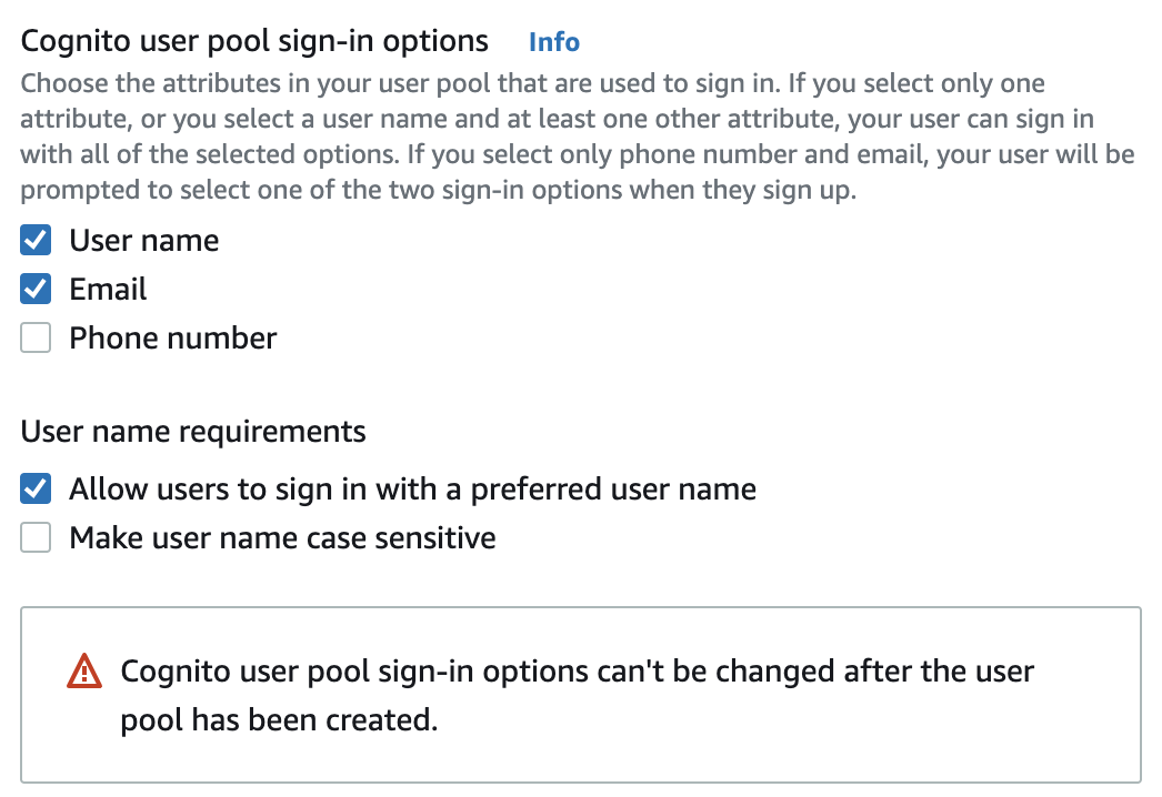 Allow users to sign in with a preferred user name: 사용자가 원하는 username으로 로그인할 수 있다.