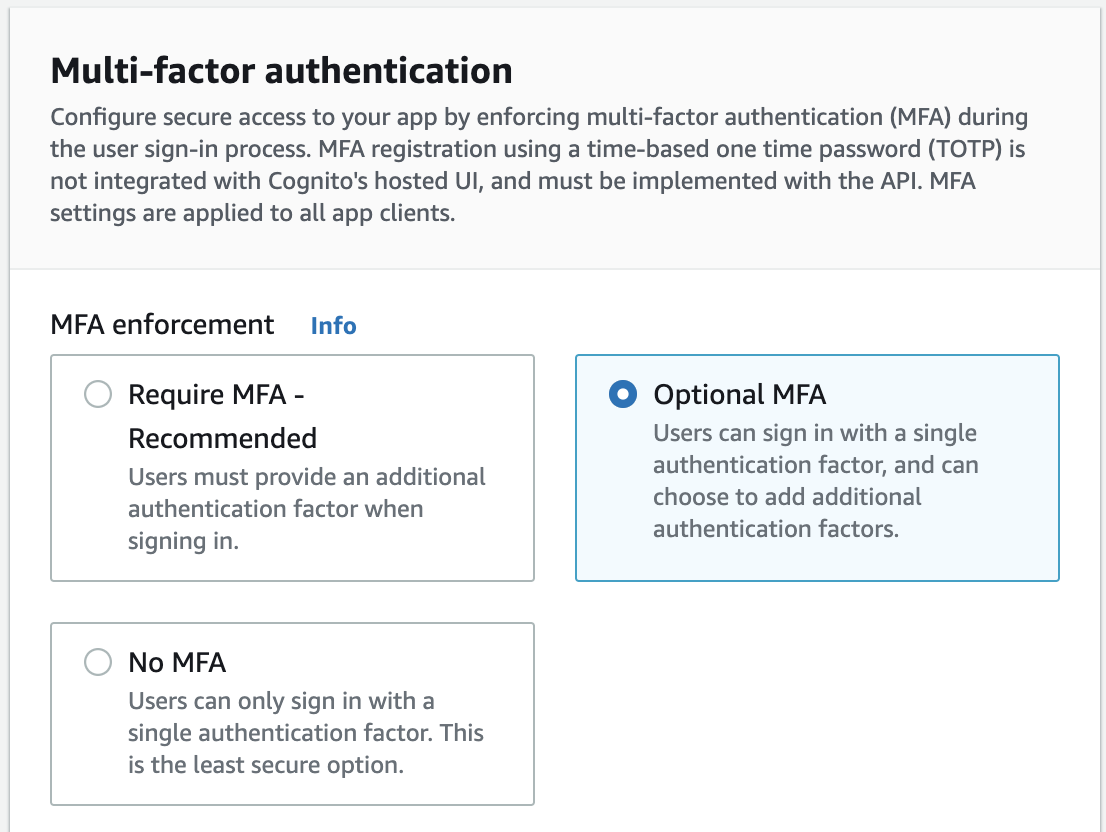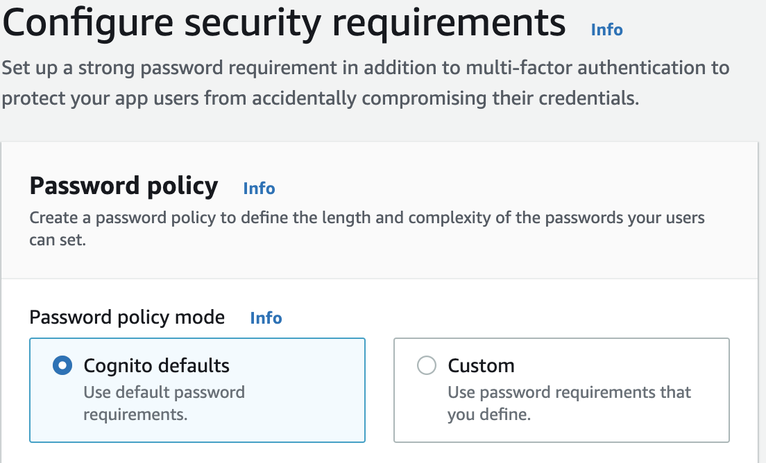 - 비밀번호 정책을 설정할 수 있다. Cognito에서 제공하는 기본 정책 템플렛을 선택하거나, 커스텀 정책을 선택할 수 있다.