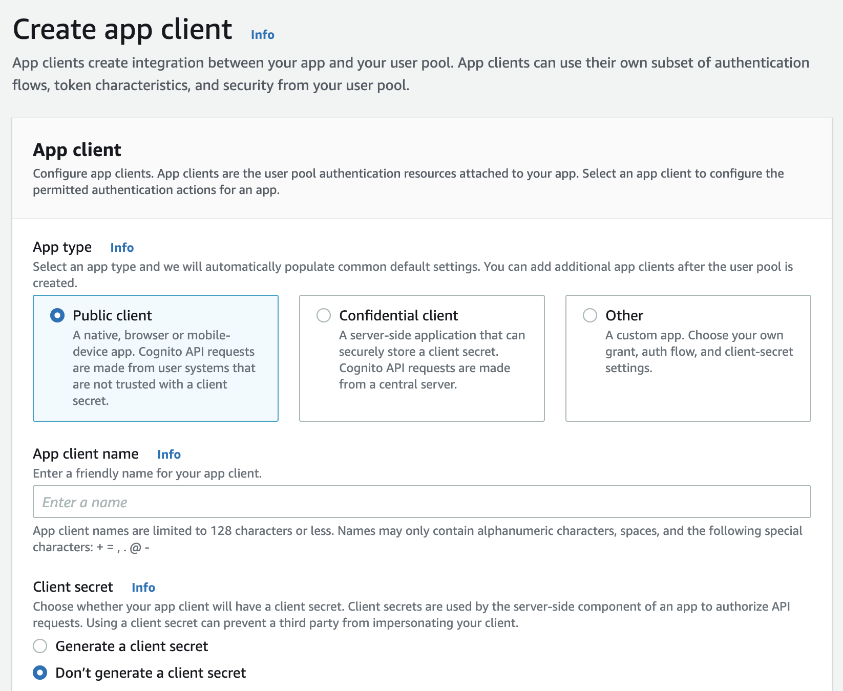- 나는 기본값 설정에서 따로 바꾼 것 없이 app client를 생성했다.