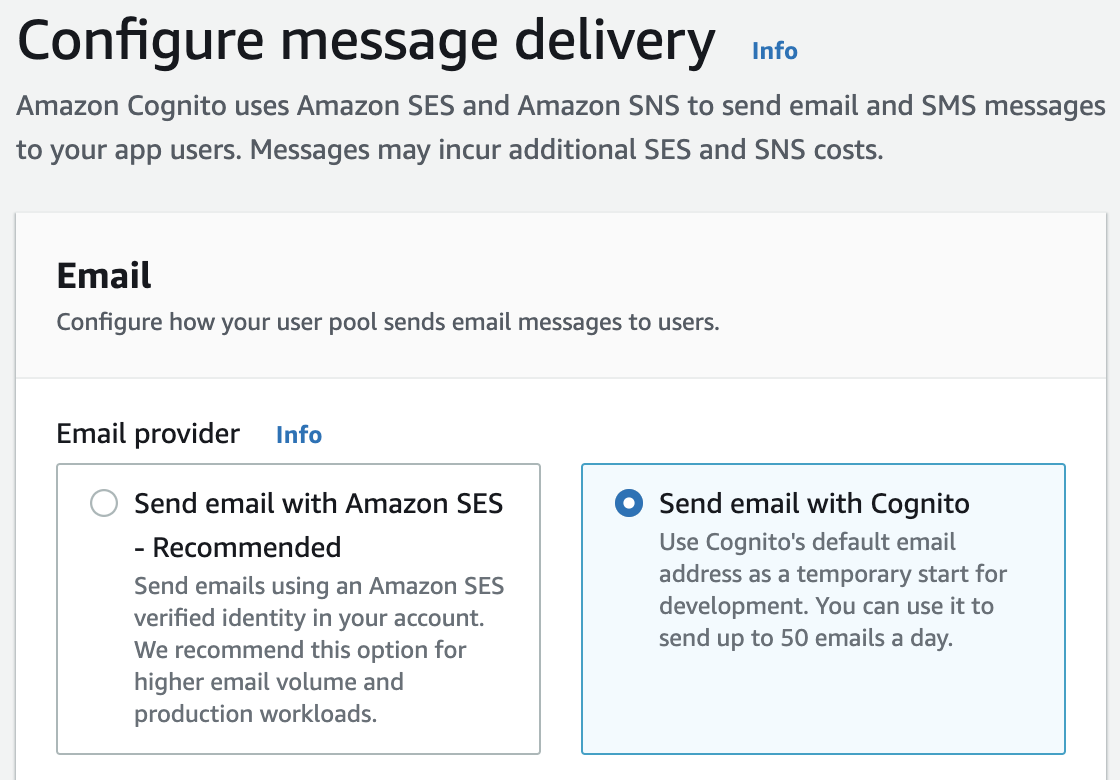 - 마찬가지로, 팀 내부에서 쓰는 앱이기 때문에 큰 볼륨의 이메일을 처리할 일이 없어 Sent email with Cognito 옵션 선택